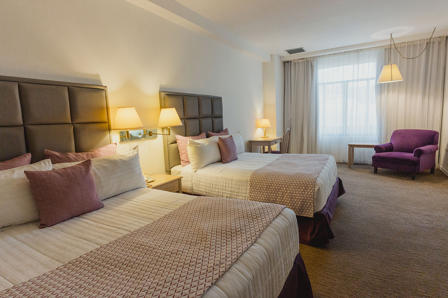 Espaciosa habitación con dos camas matrimoniales y servicios que te ayudarán a relajarte o trabajar. Cuenta con aire acondicionado, Smart TV con canales por cable, librero, mesa de trabajo y caja de seguridad, kit de planchado y baño con agua caliente las 24 horas y amenidades.