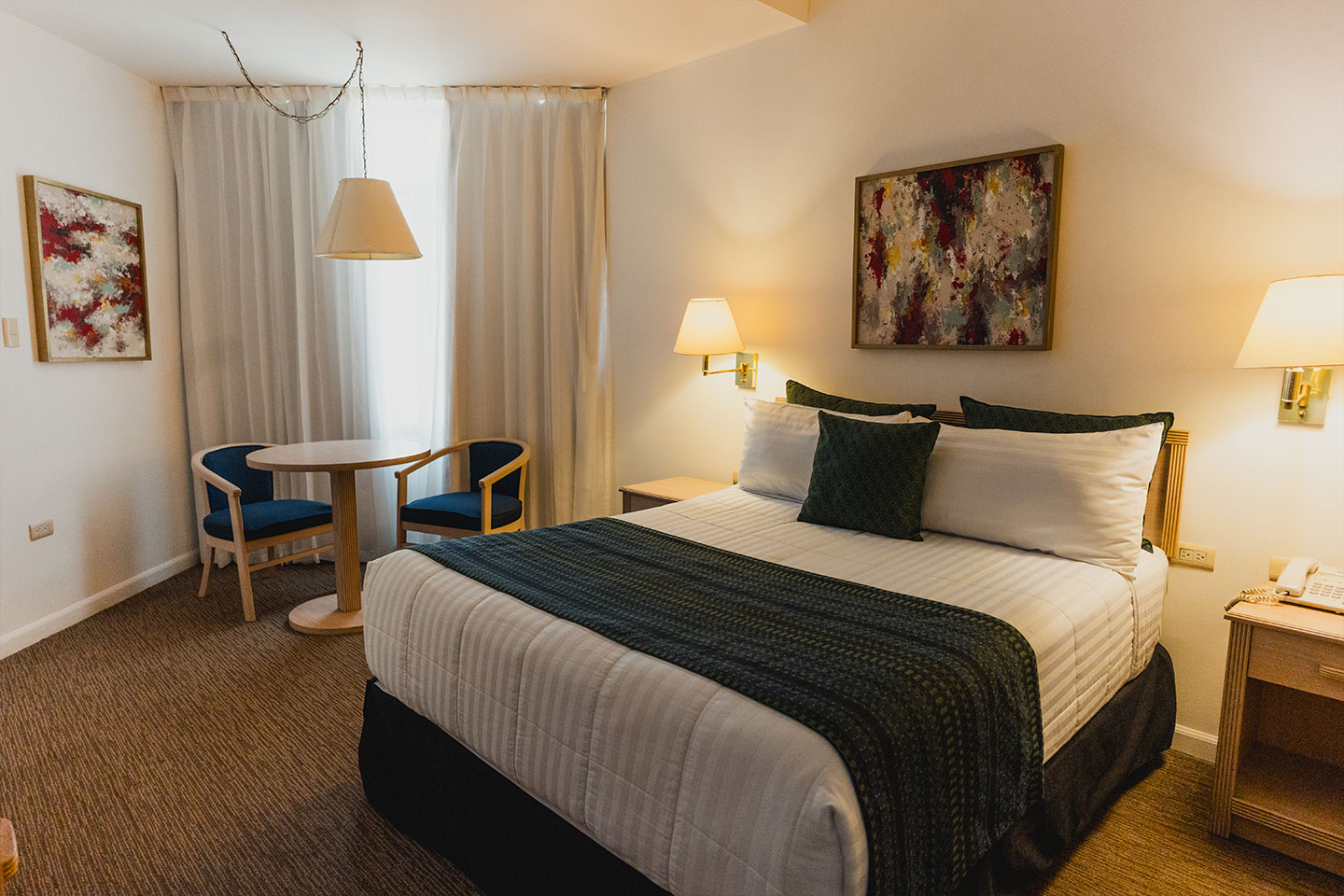 Habitaciones con una cama Queen size y todo el equipamiento necesario para una tranquila noche de descanso. Cuentan con aire acondicionado, Smart TV con canales por cable, librero, mesa de trabajo y caja de seguridad, kit de planchado y baño con agua caliente las 24 horas y amenidades.