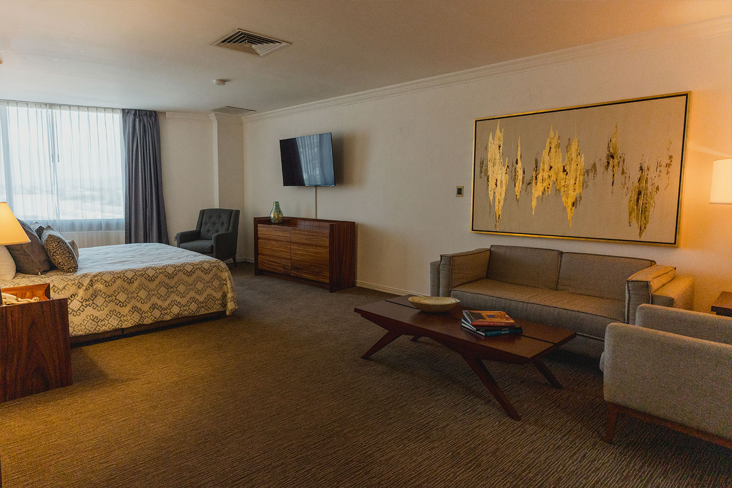 Nuestra Suite Presidencial tiene cama king size y servicios que te ayudarán a relajarte. Cuenta con televisión, aire acondicionado, sala de estar donde ponerte cómodo y caja de seguridad, además de secadora, kit de planchado y baño privado con regadera, agua caliente las 24 horas y jacuzzi. Tiene capacidad de 2 personas máximo.